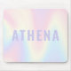 Tapis de souris tendance et personnalisé avec un arrière - plan motif arc-en-ciel pastel et votre nom en violet clair.