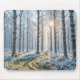 Un chemin éclairé par le soleil serpente à travers une forêt aux arbres nus et au sol recouvert de gel