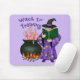 Jolie Halloween design imaginaire de sorcière novice étudiant son livre de sorts. Elle a un casquette de sorcière et une robe avec des symboles. À côté d'elle se trouve le chaudron magique. Texte dit ... Sorcière En Formation.