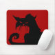 Un chat noir à la fourrure épicée et aux yeux rouges percés se tient contre un arrière - plan rouge profond. Ses yeux semblent éclatants, ajoutant une qualité étrange et surnaturelle à son aspect déjà mystérieux.