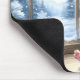 Une souris douillette en chandail rouge et un casquette assis par une fenêtre gelée tenant une tasse de cacao chaud tout en admirant un paysage enneigé avec pins et flocons de neige