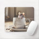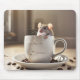 Mignonne souris dans une tasse de café avec des fissures et des grains de café.