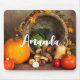Mousepad avec la photo d'une récolte d'action de grâce, posée sur une table en bois rustique. Citrouille, pommes de terre, courge etc... composent cette belle collection de nourriture. Des feuilles d'automne colorées entourent le panier de la cornucopie.