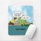 Cette conception personnalisée geocaching drôle de tapis de mousepad ou de souris a une bande dessinée avec un geocacher atteignant et disant, "il devrait être derrière ce buisson. Je serai le FTF. Courtisez-hoo !"