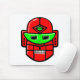 Une tête de robot en rouge avec un élégant panneau en forme de croissant vert, un troisième oeil vert, avec des dents blanches et des reflets. Il a une sorte de grain bizarre comme s'il a découvert les merveilles d'une nouvelle huile à moteur révolutionnaire. D'un dessin vectoriel original de N.A. Berry.