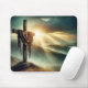 Une grande croix de bois surplombe une colline, drapée d'un tissu en lambeaux sous un ciel spectaculaire, avec des rayons du soleil perçant les nuages