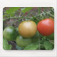 Ce beau tapis de souris présente une photographie d'une grappe de tomates mûrissant, dont une tomate cerise rouge, orange et verte alignées, poussant sur un plant de tomates dans un jardin de banlieue. La photographie a été prise en utilisant la macrophotographie pour un résultat détaillé.