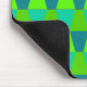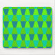 Ce tapis de souris a un design Bauhaus de trapézoïdes répétitifs dans les tons bleu et vert.