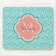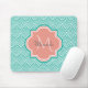 Un turquoise éco-art déco poisson échelle motif mousepad avec un badge de quatrefoil rose clair que vous pouvez personnaliser en ajoutant facilement votre monogramme et votre nom. Il fait partie de la collection de printemps de poissons Arcadia en fleurs Dahlia Monogram.