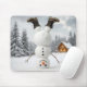 A whimsical snowman stands upside down with boots on its head as snow gently falls, revealing a cozy cabin in the snowy background