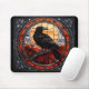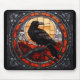 Décoré de vitraux, un corbeau déplaisant éffrayant tourne son regard vers le spectateur.
