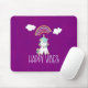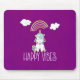 Une mousepad avec une mignonne illustration d'une licorne blanche assise sur sa croûte, souriante et à l'air heureuse. Des nuages souriants et un arc-en-ciel au-dessus. Texte : Happy Vibes. Image de levage adorable Placé sur un arrière - plan d'aquarelle rose violet.