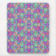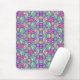 Vibrant mouse pad with a symmetrical floral and geometric pattern in pink, purple, and green hues. A white mouse lies on top, showcasing the design.