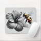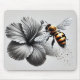 une abeille qui pollinise une fleur d'hibiscus. Cette représentation en noir et blanc met en évidence les textures délicates du corps flou de l'abeille juxtaposé aux pétales doux, révélant un monde souvent négligé.