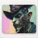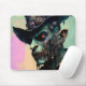 Cette oeuvre d'art saisissante présente un personnage grotesque et zombie portant un casquette en lambeaux orné de engrenages. Le personnage a des yeux orange vifs et une expression sombre, entouré d'un arrière - plan coloré et abstrait.