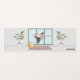 Thème de yoga de Destei, illustration d'une femme faisant le Pose Danseuse / Natarajasana. La femme est debout sur une jambe tandis que l'autre jambe tend vers le haut et se connecte à l'une de ses mains. L'autre main de la femme pointe vers l'avant alors qu'elle se contrebalance. La femme porte un débardeur de couleur rose et un capri gris foncé qui expose ses veaux et ses orteils. Les cheveux bruns de la femme sont attachés sur un petit pain derrière la tête avec un élastique à cheveux de couleur marron. La femme est placée dans une salle moderne avec trois grandes fenêtres et de grands plantes verts feuillus. La femme est debout sur un tapis de yoga couleur rose. Il y a une balle ronde jaune à côté de la femme. Il y a aussi une zone de texte personnalisable pour un nom ou un autre texte personnalisé.