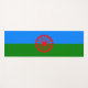 Ce dessin est orné du drapeau romani, qui est le drapeau international du peuple romani. Le drapeau est constitué d'un arrière - plan de bleu et de vert, représentant respectivement les cieux et la terre ; il contient également un chakra rouge à 16 branches, ou carrousel, au centre, qui représente la tradition itinérante du peuple romani et est aussi un hommage au drapeau de l'Inde. Le drapeau a été approuvé par les représentants de diverses communautés roms lors du premier Congrès mondial des Roms (WRC), qui s'est tenu à Orpington en 1971.