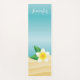 Ce tapis de yoga présente l'illustration originale de Destei d'une belle fleur de frangipanier blanc avec deux feuilles verts. La couleur arrière - plan est bleue avec un motif qui imite l'aspect sable au fond. En haut, il y a une zone de texte personnalisable pour un nom dans une belle police de caractères de script blanc.