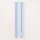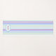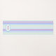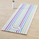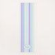 Tapis de yoga personnalisé fait dans un motif rayé bleu, violet, vert et blanc. Les graphiques d'une zone de texte décoratif ont du texte personnalisé prêt à être personnalisé. Le même design est présenté à l'avant et à l'arrière du tapis.