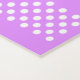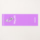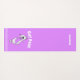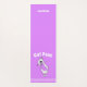 Tapis de yoga mauve clair avec de mignons dessins animés d'un chat blanc. Texte blanc voûté, au-dessus du chat lit, Pose de chat (pose de yoga). Une bande de pois blancs court à travers le bout du tapis, à l'extrémité du chat. L'autre extrémité du tapis a du texte personnalisé blanc, personnalisable selon vos besoins.