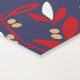 Vibrant modern botanical pattern featuring red, gold, and white leaves dancing across a deep navy background.