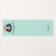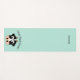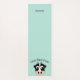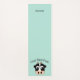 Tapis de yoga de couleur Aqua avec dessins animés du visage d'une vache. Texte noir voûté, au-dessus de la vache lit, Pose Face de vache (pose de yoga). L'autre extrémité du tapis a du texte noir personnalisé, personnalisable selon vos besoins.