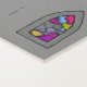 Dessin graphique, d'un bleu-gris, de forme gothique, fenêtre, dans les couleurs de ; bleu, violet, fuschia, gris et or, contre un gris foncé, simulant l'arrière - plan, un vitrail, fenêtre de l'église.