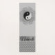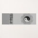 Un tapis inspirant avec un élégant symbole de mosaïque yin yang entouré d'argent lumineux fleuri et de petites brindilles feuillues sur un arrière - plan gris puis sur le fond est un motif de chevron brillant argent avec un ruban d'argent chatoyant où vous pouvez le personnaliser pour en faire votre propre ou garder comme il est avec le goût du nom. Des vibes élégantes.