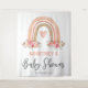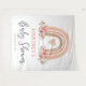 Tapisserie de fête prénatale bohème rustique pour bébé fille avec un fond blanc simple, un arc-en-ciel bohème aquarelle mignon, des fleurs roses élégantes et un modèle de bienvenue moderne facile à personnaliser.