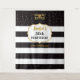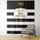 C'est une tapisserie de fête d'anniversaire moderne élégante avec un masque doré et noir et des lettrages calligraphiés amusants