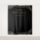 Cette tapisserie élégante de stand photo de mariage présente une bordure d'agate noire et dorée en haut et en bas sur un fond noir. Personnalisez le texte doré avec les mots "Mariage" (ou événement de votre choix) en écriture manuscrite, ainsi que le nom de la future mariée et la date en police copperplate.