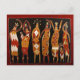 Voici une photo d'une tapisserie suspendue dans une corniche en Tanzanie, en Afrique. Six femmes bougent, balancent et dansent. Il y a un enfant et une femme a un bébé sur la hanche. Les femmes et les enfants sont habillés de beaux vêtements lumineux et ont des ornements dans leurs cheveux et de nombreuses formes de bijoux sur leur corps. Les figures sont contre un arrière - plan noir avec une bordure rouge profonde comme partie de la tapisserie. Ne serait-ce pas une excellente invitation à la fête !