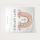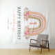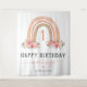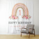 Tapisserie rustique bohème pour le 1er anniversaire d'une fille, avec un fond blanc simple, un arc-en-ciel bohème aquarelle mignon, des fleurs roses élégantes et un modèle "joyeux anniversaire" moderne facile à personnaliser.