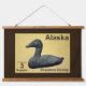 Un timbre-poste d'un Alaska mythique et indépendant, orné d'une sculpture en pierre à savon d'un canard à Eider. L'arrière - plan est peau d'orignal tannée au cerveau. Il s'agit d'un rendu numérique, pas d'un objet en pierre à savon. L'Eider à duvet, Somateria mollissima, est le plus grand canard d'Europe et d'Amérique du Nord (à l'exception du Canard de la Muscovy qui ne touche que l'Amérique du Nord dans un état sauvage à l'extrême sud du Texas) L'Eider est distribué sur les côtes nord de l'Europe, de l'Amérique du Nord et de la Sibérie orientale. Il se reproduit dans l'Arctique et dans certaines régions tempérées du nord, mais hiverne un peu plus au sud dans les zones tempérées, lorsqu'il peut former de grands troupeaux dans les eaux côtières. Il peut voler à des vitesses allant jusqu'à 70 mi/h (113 km). L'Eider se caractérise par sa forme encombrante et son grand bec en forme de coin. Le mâle est indéniable, avec son plumage noir et blanc et sa nuque verte. La femelle est un oiseau brun, mais on peut toujours facilement la distinguer de tous les canards, sauf d'autres espèces d'eiders, en fonction de la taille et de la forme de la tête. L'appel de ce canard est un joli "ah-ooo". L'espèce est souvent facilement accessible. Les dessins des races d'Europe, de l'Est de l'Amérique du Nord et d'Asie/Ouest de l'Amérique du Nord peuvent être distingués par des différences mineures de couleur du plumage et du bec. Cette espèce plonge pour les crustacés et les mollusques, les moules étant un aliment favori. L'Eider mangera les moules en les avalant entières; les coquilles sont ensuite écrasées dans leur estomac et excrétées. Lorsque vous mangez un crabe, l'Eider enlève toutes ses griffes et ses pattes, puis il mange le corps de la même façon. Il est abondant, avec des populations d'environ 1,5-2 millions d'oiseaux en Amérique du Nord et en Europe, et aussi un grand nombre mais inconnu dans l'est de la Sibérie. Une colonie d'eiders particulièrement célèbre vit sur les îles Farne, à Northumberland, en Angleterre. Ces oiseaux ont fait l'objet de l'une des premières lois sur la protection des oiseaux, établie par Saint Cuthbert en 676. Environ 1 000 couples y nichent encore chaque année. Comme Saint-Cuthbert est le saint patron de Northumberland, il était naturel que l'eider soit choisi comme oiseau emblème du comté; les oiseaux sont encore souvent appelés canards de Cuddy dans la région, "Cuddy" étant la forme familière de "Cuthbert". L'Eidre commun est l'une des espèces auxquelles s'applique l'Accord sur la conservation des oiseaux aquatiques migrateurs d'Afrique-Eurasie (AEWA). Les eiders sont des éleveurs coloniaux. Ils nichent sur les îles côtières dans des colonies de moins de 100 à plus de 10 000 à 15 000 individus. Les eiders femelles présentent souvent un haut degré de philopatrie natale, où ils reviennent se reproduire sur la même île où ils ont été éclos. Cela peut conduire à un degré élevé de relation entre les individus qui nichent sur la même île, ainsi que le développement de structures sociales féminines basées sur la parenté. Cette relation a probablement joué un rôle dans l'évolution des comportements de reproduction coopératifs chez les eiders. Parmi ces comportements, on peut citer la ponte d'oeufs dans les nids d'individus apparentés et la crèching, où les eiders femelles s'associent et partagent le travail d'élevage des ducklings. Le nid de l'eider est construit près de la mer et est bordé de la célèbre édredon, arraché du sein de la femelle. Ce revêtement doux et chaud a été longtemps récolté pour remplir les coussins et les courtepointes, mais ces dernières années a été largement remplacé par le duvet des oies agricoles domestiques et des alternatives synthétiques. Bien que les coussins de duvet ou les courtepointes soient maintenant rares, la récolte des duvet se poursuit et est durable, comme cela peut être fait après que les canetons quittent le nid sans nuire aux oiseaux.