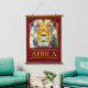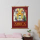 This travel theme design features a colorful wildlife portrait of a lion, the king of beasts, done in creative wildlife pop art style with the word: AFRICA in gold on a dark red background. Africa is a popular vacation destination. #vacation #wallart