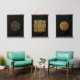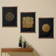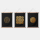 Un ensemble si trois conceptions de nouages célestes complexes, une croix de nouage celtique, et des Mandalas de nouages triples celtiques avec spirales éternelles et noeuds de trinité, en or et noir sur un parchemin ancien.
