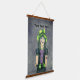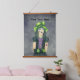 Cette tapisserie aux cintres en bois a une fille à l'allure gothique dans un casquette vert vif, robe violet et noir avec tatouages et gants sans doigts sur un arrière - plan gris foncé.