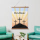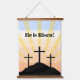 Célébrez la résurrection avec l'élégance rustique : "Il est ressuscité !" Tapisserie recouverte de bois Déclarez le message joyeux de Pâques avec notre frappant "Il est ressuscité !" Tapisserie murale En Bois. Cette pièce unique présente un arrière - plan rayé d'inspiration rétro qui ajoute une touche de charme vintage, magnifiquement contrasté par une silhouette puissante des trois croix du Calvaire au premier plan. Les couleurs vives et les lignes nettes du design sont imprimées sur du polyester doux et léger, assurant un affichage visuel impactable sur n'importe quel mur. La silhouette poignante des croix est un puissant rappel du sacrifice, tandis que le texte audacieux "Il est ressuscité !" proclame la victoire triomphante sur la mort. Customisez le texte comme vous le souhaitez ! Fait un grand cadeau pour une église, conformation, Pâques, Fête des Mères, Fête des pères, Noël et autres occasions spéciales.