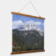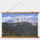 Decorate your living space with this horizontal, hanging wall tapestry with wooden tops that features a photographic landscape image of snow capped Mount Rainier in the clouds overlooking a scenic, forested valley in Washington State.