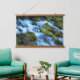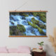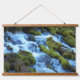 Decorate your living space with this horizontal, hanging wall tapestry with wooden tops that features a photographic landscape image of a scenic forest waterfall with moss covered rocks and logs.