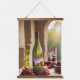 Wall tapestry with beautiful illustration of a bottle of wine and a glass of wine surrounded by red grapes.