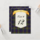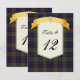 Belle carte de numéro de table de mariage à carreaux écossais réalisée avec le motif tartan coloré violet, noir, vert, rouge et jaune du clan MacLellan. Une zone de texte de couleur crème décorative, au milieu, comporte des graphiques d'un ruban de style bannière jaune doré, en haut. Des graphiques d'un Luckenbooth de ton doré, symbole de l'amour écossais, ornent le milieu du ruban. Le texte en noir est entièrement personnalisable pour répondre à vos besoins de réception. Produits de mariage assortis disponibles. Personnalisez-en un pour chaque table à votre réception de mariage.