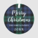 Cet ornement de vacances classique présente une photo préférée de votre famille encadrée par un arrière - plan à motif écossais à motif écossais bleu marine et vert chasseur noir. Conseil : recadrez votre photo au format carré avant de la télécharger sur le site. Le dos de l'ornement comprend un accueil "Joyeux Noël" en écriture moderne avec texte personnalisé qui peut être personnalisé pour votre nom de famille et l'année.