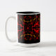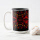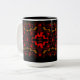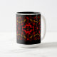 Cette tasse comporte une conception abstraite primitive de foudre et de soleils dans des tons de la terre d'orange, de rouge, de noir et de brun.
