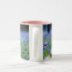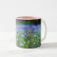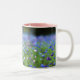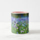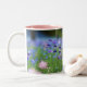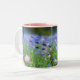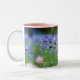 Un champ de fleurs de maïs dans les tons bleu profond et pâle, violet, lavande et rose, avec des feuilles vert pâle.