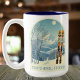 Mug d'un merveilleux séjour de ski dans les belles montagnes françaises de Courchevel, France! Cette tasse possède une arche avec un paysage de montagne bleu-gris et des planches de ski rétro dans un motif tribal orange au premier plan. Le reste de la carte est dans un beau ton bleu clair avec l'emplacement lettrage dans une police moderne. Le design est une belle combinaison rétro et moderne, et j'espère que vous en apprécierez !