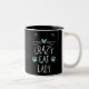 Crazy cat lady en majuscules sans police manuscrite avec deux empreintes de pattes bleu turquoise et un coeur bleu qui sert de nez de chat avec des whiskers blancs et deux oreilles triangulaires blanches.