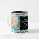 Un cadeau sucré pour la nouvelle grand-mère, et une bonne idée pour la fête des mères. Cette jolie teinte turquoise, presque turquoise, est assortie d'une empreinte dalmate amusante en noir et blanc sur cette tasse de grand-mère Fière avec deux photos de son nouveau petit-enfant et le nom et les détails de son bébé.