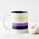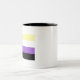 Le drapeau non binaire a été créé en 2014 par l'activiste Kye Rowan. Chaque couleur de bande représente différents types d'identités non binaires : le jaune pour les personnes qui s'identifient en dehors du binaire de genre, le blanc pour les personnes non binaires avec plusieurs genres, le violet pour celles qui ont un mélange de genres masculin et féminin, et le noir pour les personnes agender.