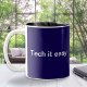 Détendez-vous et profitez de votre pause café avec cette tasse élégante. En bleu nuit foncé, la tasse affiche le jeu de mots amusant 'Tech it easy' en lettres blanches et claires. Personnalisez l'autre côté avec une initiale monogramme pour la touche finale. Dans un style minimaliste apaisant, la tasse humoristique est un cadeau idéal pour les professionnels de l'informatique, les étudiants en informatique et les amateurs de technologie.